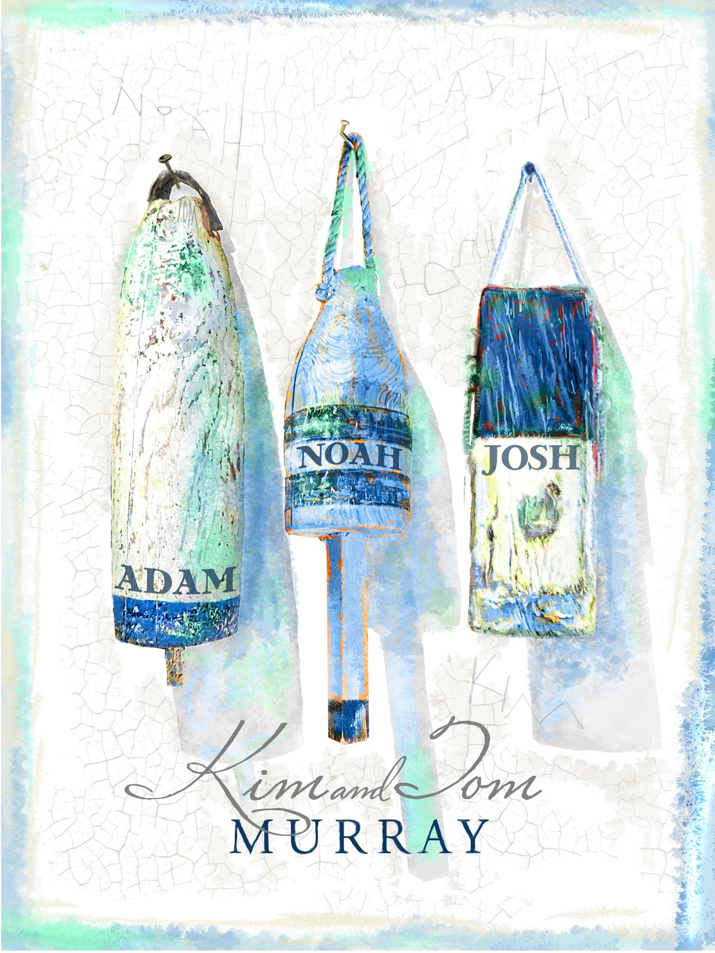 Blue Buoys hang on a crackled white wall. Fresh coastal breezes in this timeless classic composition celebrate the simplicity of life at the shore, lobsters or crabs for lunch, sunsets watching seagulls dance over the water.