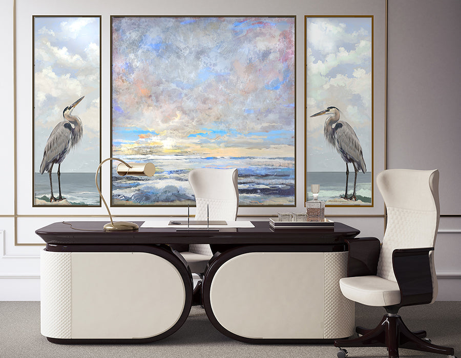 I painted this heron to have a partner and was intrigued with the tall vertical format of the canvas knowing there are unique spaces where you may want a piece of art. If you need symmetery there is a companion Heron that could compliment the sides of a doorway , entrance or next to a large tv. Mostly soft neutrals with a touch of blue and sand hues, the sky above reminds you that any minute herons will fly up and away to fish a quieter spot.