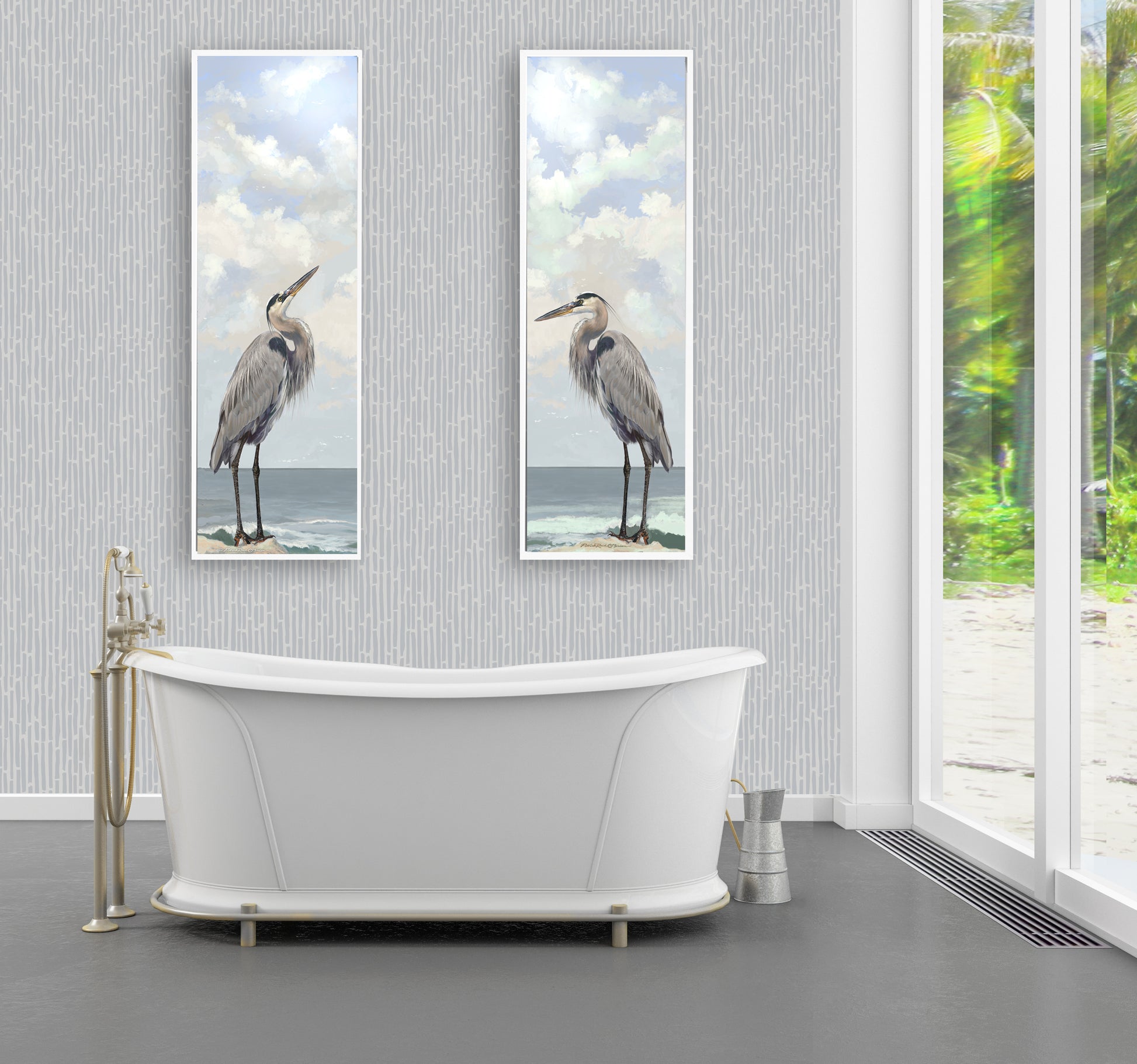 I painted this heron to have a partner and was intrigued with the tall vertical format of the canvas knowing there are unique spaces where you may want a piece of art. If you need symmetery there is a companion Heron that could compliment the sides of a doorway , entrance or next to a large tv. Mostly soft neutrals with a touch of blue and sand hues, the sky above reminds you that any minute herons will fly up and away to fish a quieter spot.
