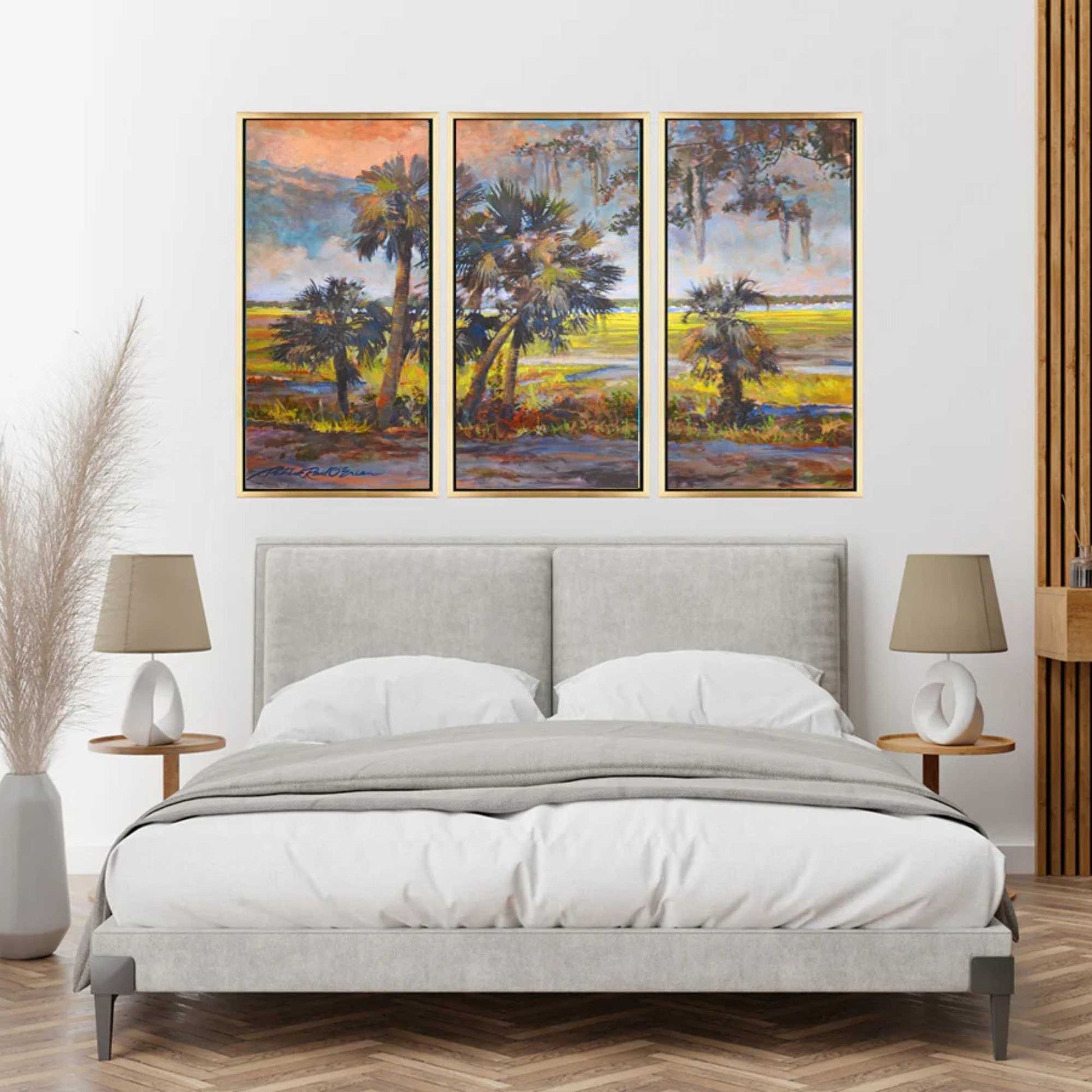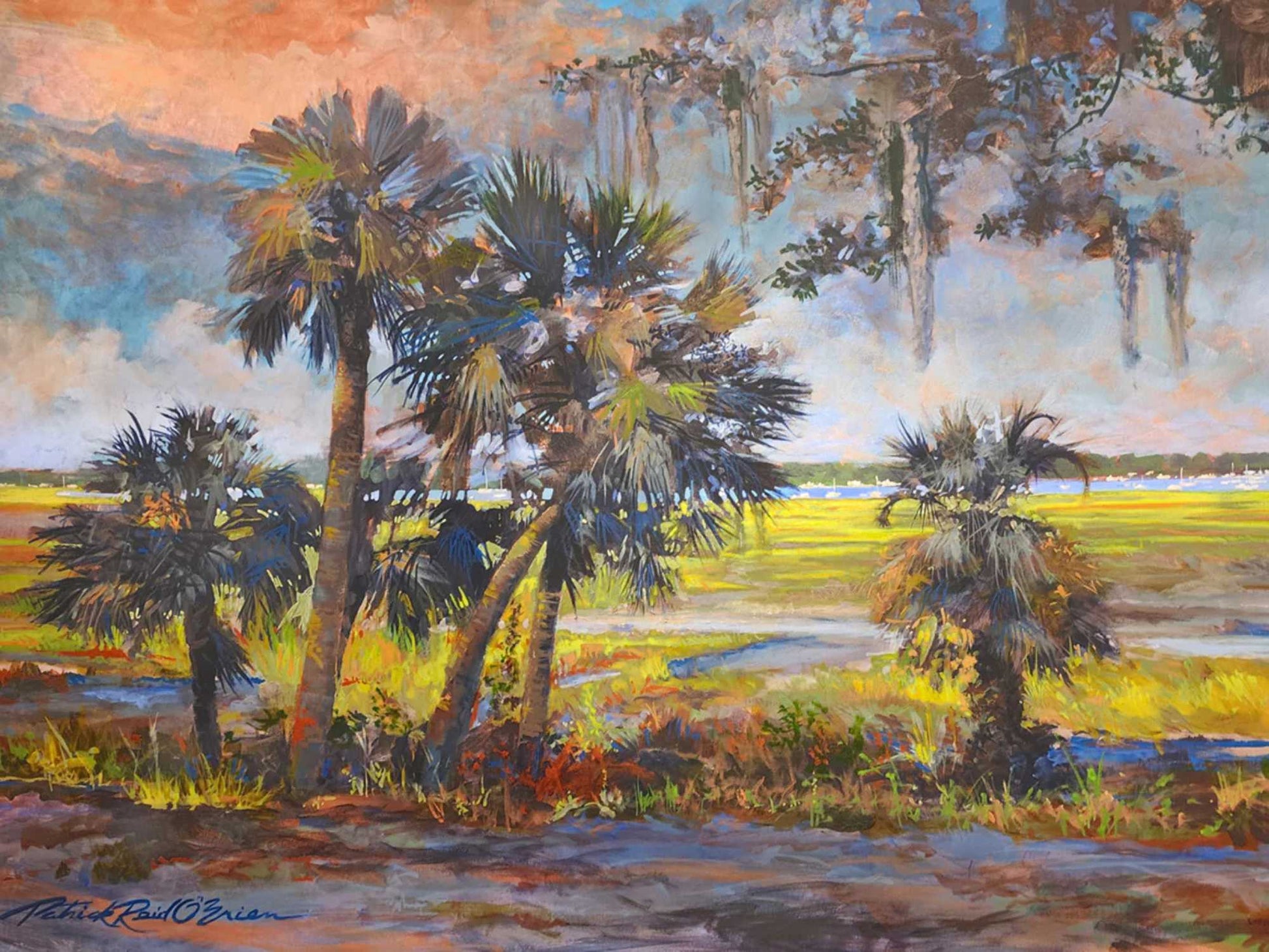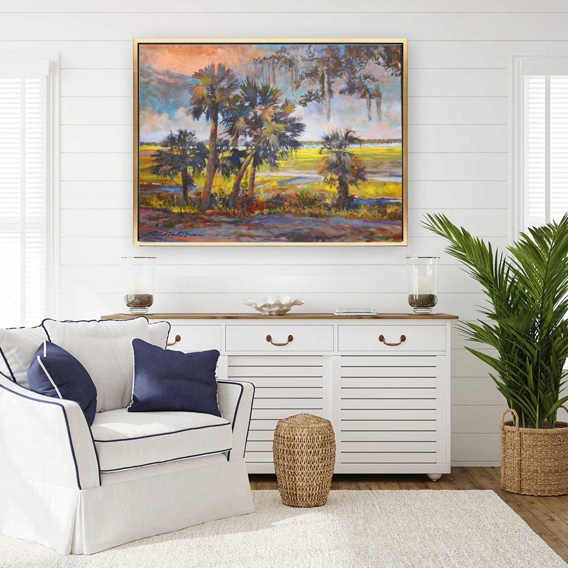 Through the Years captures the quiet elegance of the Lowcountry marshlands near Beaufort, where palms rise in the shade of ancient live oaks and the horizon stretches wide beneath the morning sun. A distant ribbon of blue water hints at boats waiting to set sail, filling the scene with both calm and possibility.